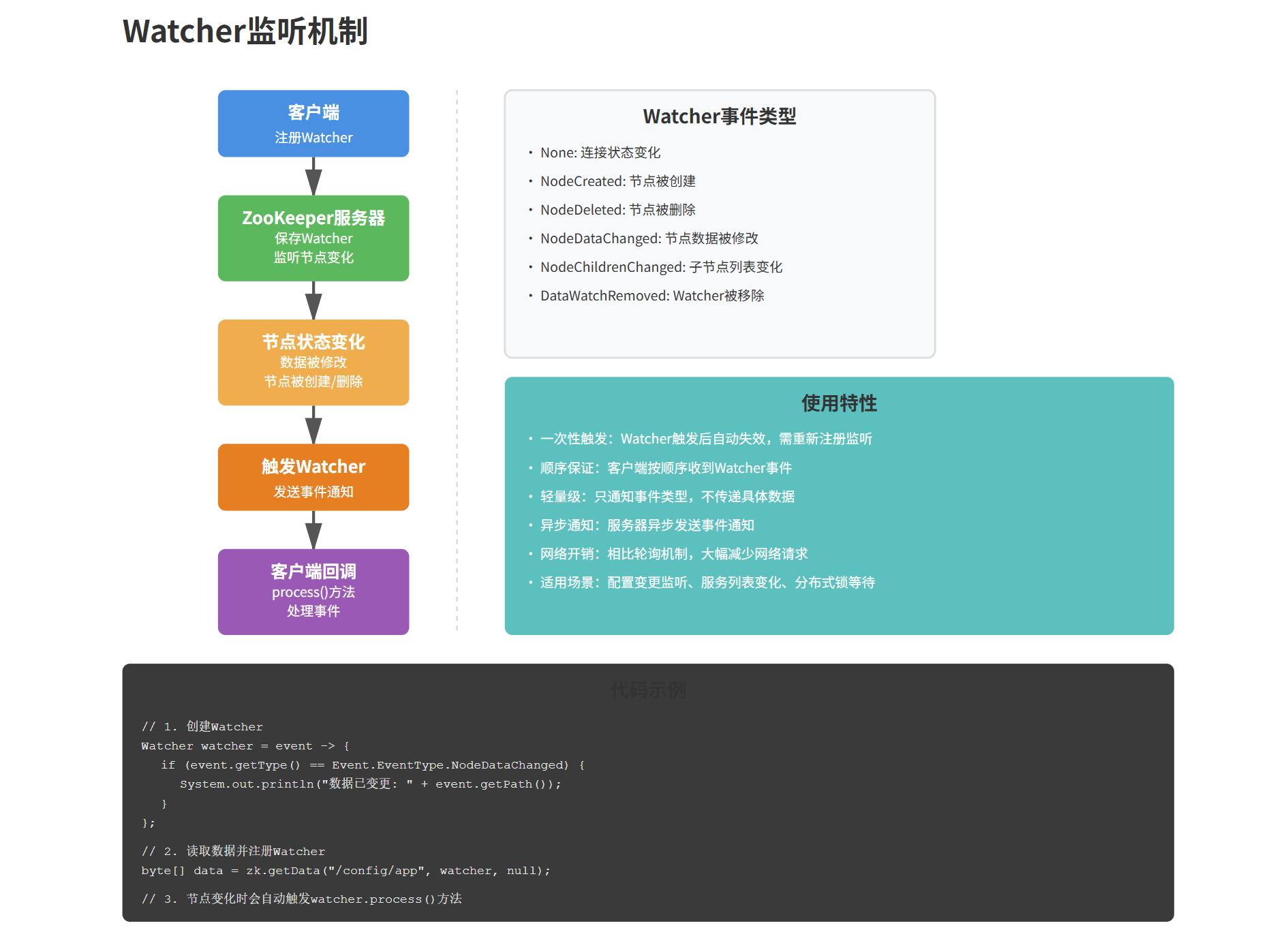 - watcher:监听器,用于接收ZooKeeper的事件通知