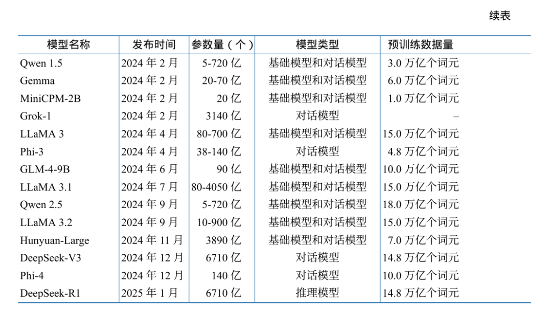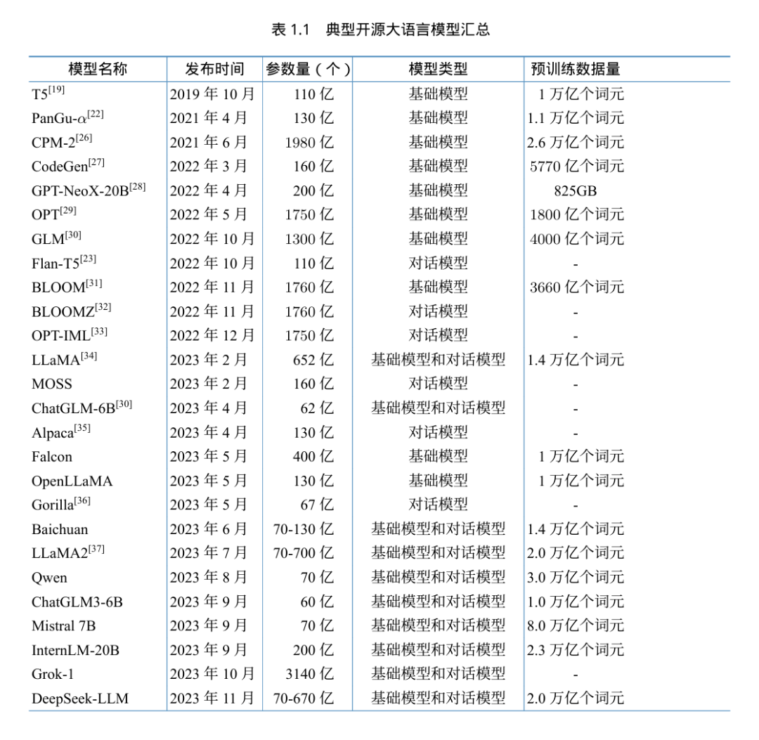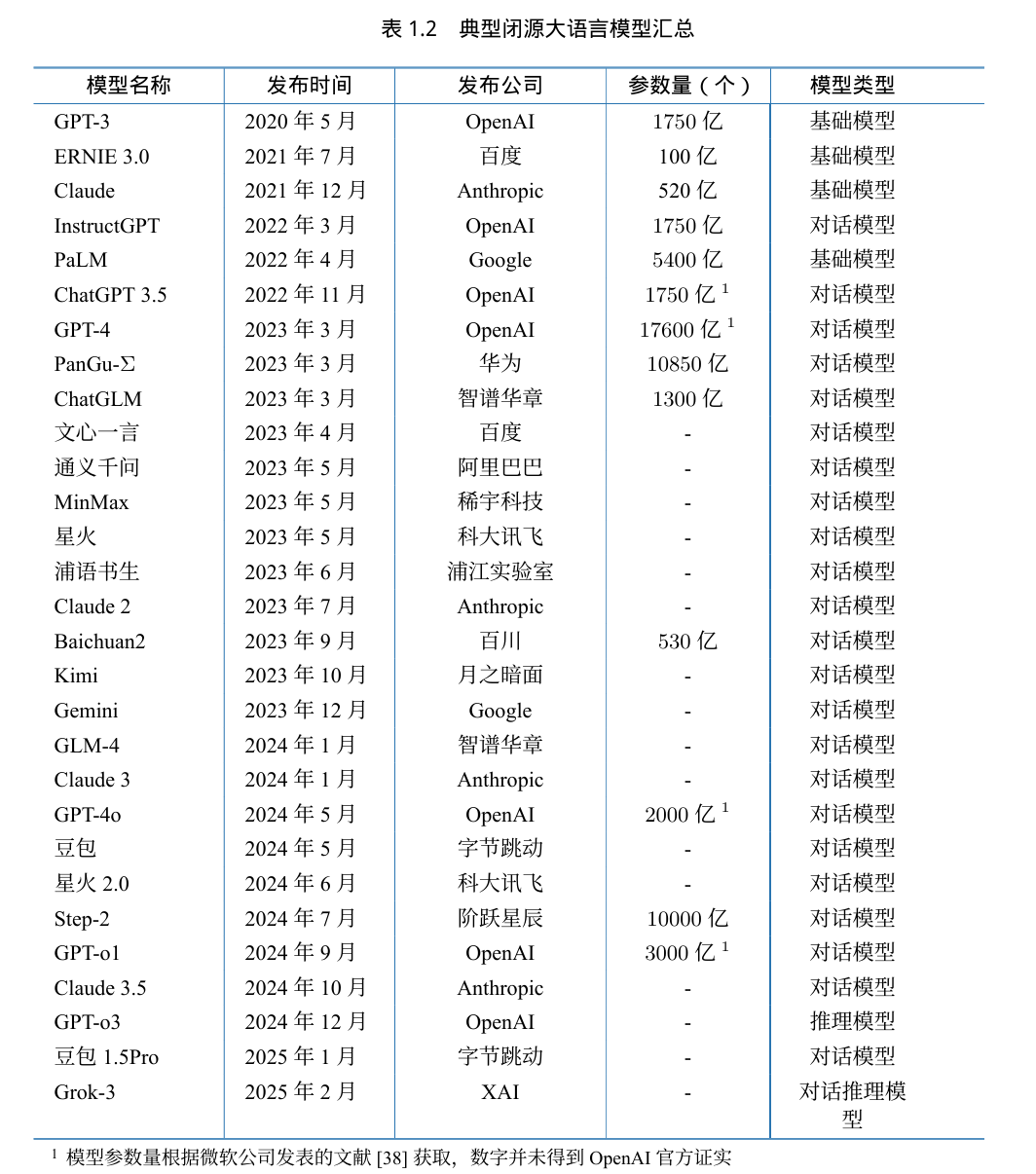 表1.1 和表1.2 分别给出了截至2025年2月典型开源和闭源大语言模型的基本情况。可以看到,从2022年开始,大语言模型的数量呈爆发式的增长,各大公司和研究机构都在发布不同类型的大语言模型。模型类型中,基础模型是指仅经过预训练的模型;对话模型是指在预训练模型基 础上经过有监督微调和强化学习训练的模型,具备对话和完成任务的能力;推理模型是指专注于逻辑推理增强的大语言模型。