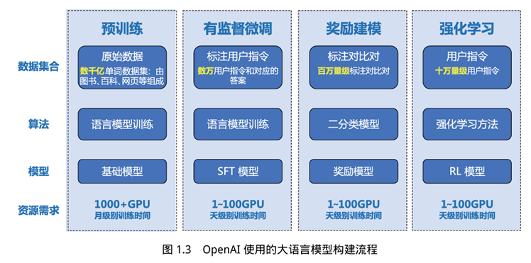 根据OpenAI联合创始人AndrejKarpathy在微软Build2023大会上公开的信息,OpenAI使用 的大语言模型构建流程如图1.3所示,主要包含四个阶段:预训练、有监督微调、奖励建模和强化学习。这四个阶段都需要不同规模的数据集及不同类型的算法,会产出不同类型的模型,所需要的资源也有非常大的差别。