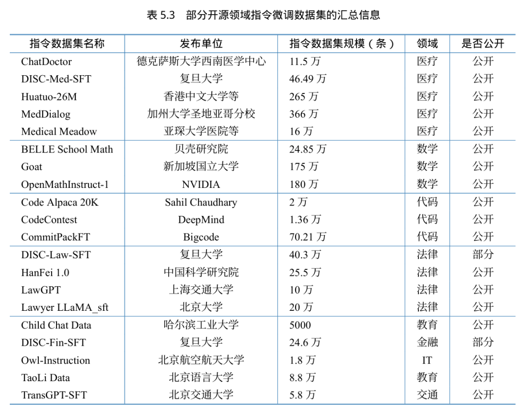 指令数据集对于指令微调非常重要,无论手工还是自动构建都需要花费一定的时间和成本。目 前已经有一些开源指令数据集,本节将选择一些常用的指令数据集进行介绍。如果按照类型来划 分,指令微调数据集可以分为两大类:通用指令微调数据集(GeneralInstructionFine-tuningDatasets) 和特定领域指令微调数据集(Domain-specificInstructionFine-tuningDatasets)。通用指令微调数据 集涵盖了各种跨领域指令,旨在提高模型在通用任务上的效果以及指令遵循能力效果。特定领域指令微调数据集中的指令是专门为特定领域设计的。例如,法律领域指令集包含法律考试、法律 咨询、法律问答等任务的指令数据。