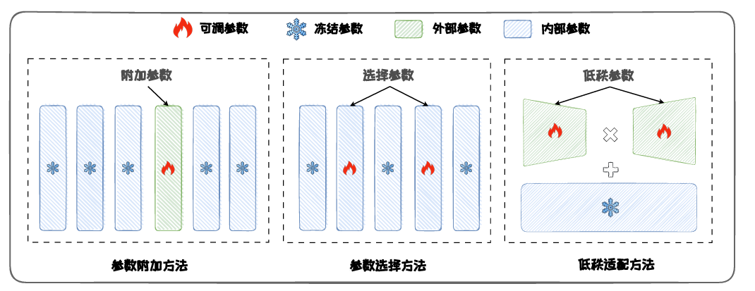 参数高效微调(Parameter-Efficient Fine-Tuning,PEFT)旨在避免微调全部参数,减少在微调过程中需要更新的参数数量和计算开销,从而提高微调大语言模 型的效率。主流的PEFT方法可以分为三类:参数附加方法(AdditionalParameters Methods),参数选择方法(ParameterSelection Methods)以及低秩适配方法(Low Rank Adaptation Methods)。