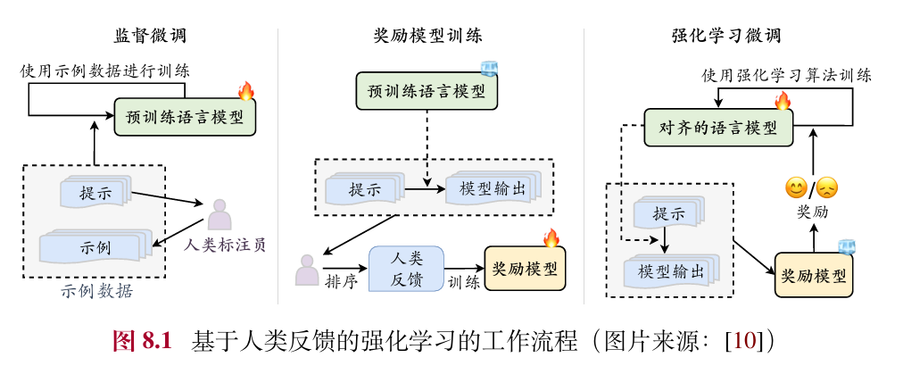图8.1 展示了RLHF整体训练框架的三个阶段,下面分阶段进行具体介绍。