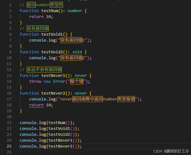 可以看到上面的testNever2会报错,因为这里never表示永远不会有返回值,而我这里返回一个number值10.所以报错了
