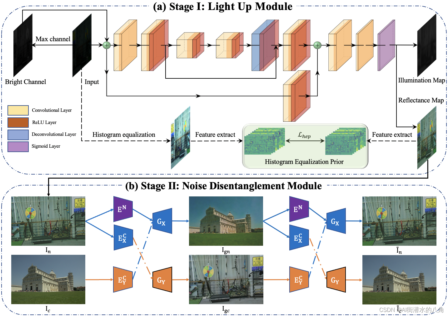 基于深度学习的微光图像增强方法通常需要大量的成对训练数据,这在现实世界中是不切实际的。最近,已经探索了无监督的方法来消除对成对训练数据的依赖。然而,由于缺乏先验,它们在不同的现实世界场景中表现不稳定。为了解决这个问题,文章提出了一种基于有效先验的无监督微光图像增强方法,称为直方图均衡先验(HEP)。文章的工作是受到了一个有趣的观察结果的启发,即直方图均衡增强图像的特征图和地面实况是相似的。具体而言,文章制定HEP以提供丰富的纹理和亮度信息。它嵌入到发光模块(LUM)中,有助于将低光图像分解为照度图和反射率图,反射率图可以被视为恢复的图像。然而,基于Retinex理论的推导表明,反射率图受到了噪声的污染。文章引入了一种噪声去纠缠模块(NDM),在未配对干净图像的可靠帮助下,去纠缠反射图中的噪声和内容。在直方图均衡先验和噪声解纠缠的指导下,我们的方法可以恢复更精细的细节,并且能够在现实世界的低光场景中抑制噪声。大量的实验表明,我们的方法与最先进的无监督微光增强算法相比表现良好,甚至与最新的有监督算法相匹配。
