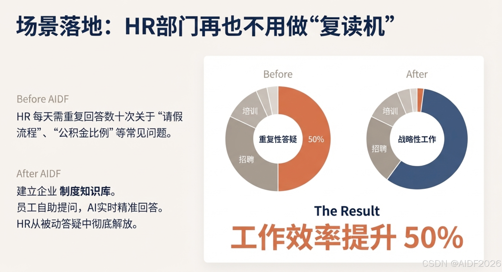 HR 部门不用复读机了: 以前 HR 每天要回答几十次“请假流程”、“公积金比例”等重复问题。现在建立了 制度知识库,员工有问题直接问 AI,HR 从被动答疑中解脱出来,工作效率提升了 50%。