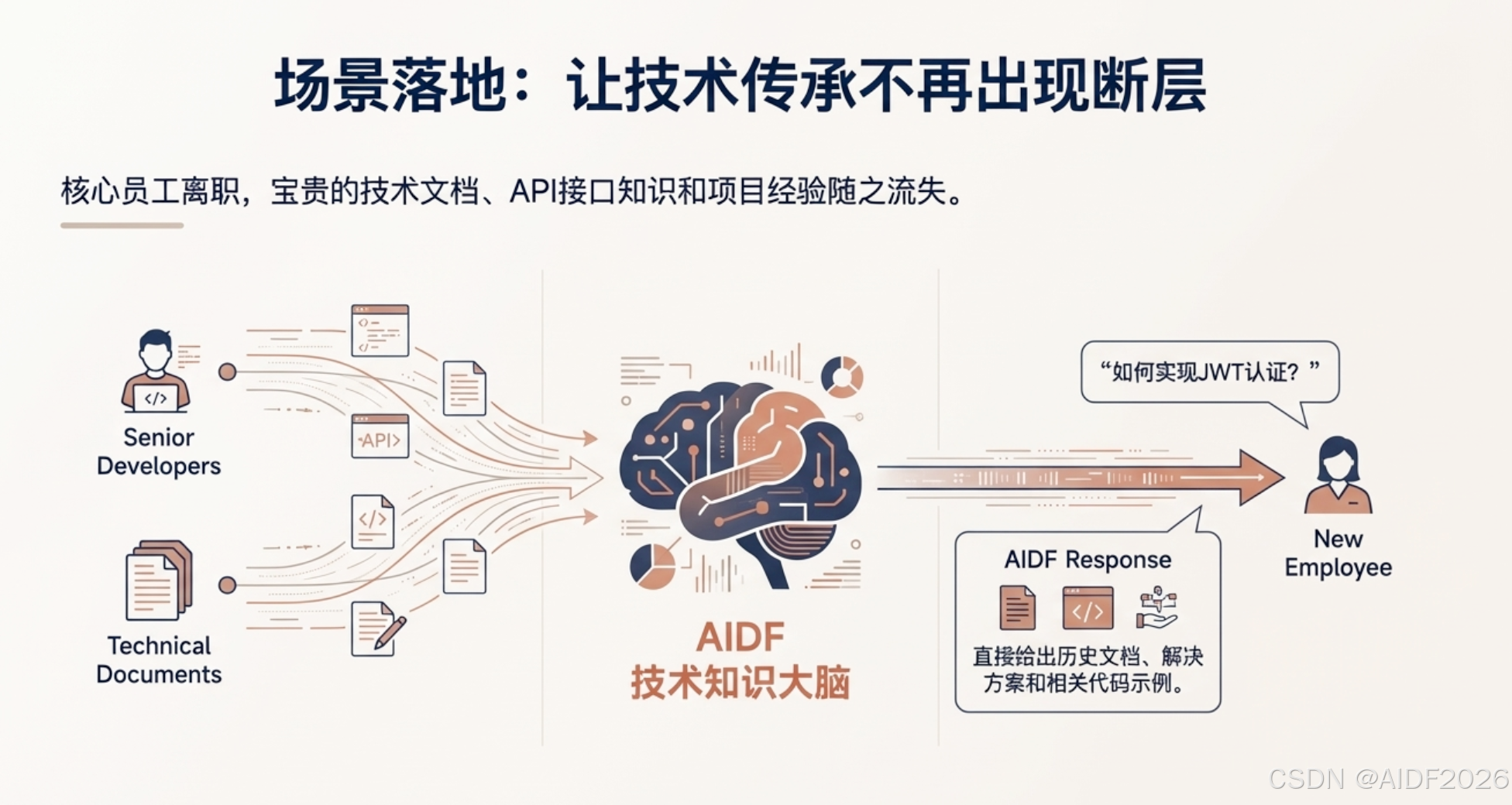 技术传承不再断层: 老员工离职往往带走核心知识。我们将技术文档和 API 接口文档导入 AIDF 后,新员工遇到技术难题,直接问系统“AIDF项目架构是怎么样的?”,系统直接给出历史文档和相关说明。