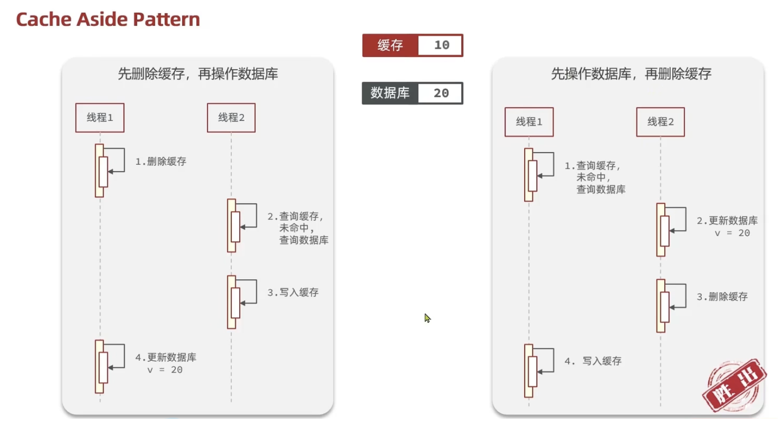 线程 B(读):动作是 查缓存(Miss) -> 查数据库 -> 写入缓存。