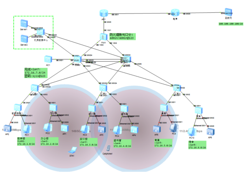 根据学校整体划分成核心层、汇聚层与接入层。核心层采用双机热备,汇聚层通过双链路链接到主备核心。学校内部互联网之间通过出口路由器进行连接,核心与出口路由之间部署一台防火墙做网络安全防御。具体网络拓扑规划如下: