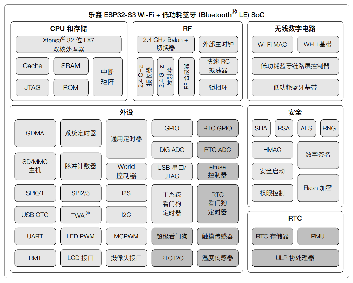ESP32-S3 是一款低功耗的 MCU 系统级芯片 (SoC),支持 2.4 GHz Wi-Fi 和低功耗蓝牙 (Bluetooth® LE) 无线通 信。芯片集成了高性能的 Xtensa® 32 位 LX7 双核处理器、超低功耗协处理器、Wi-Fi 基带、蓝牙基带、RF 模块以 及外设。
