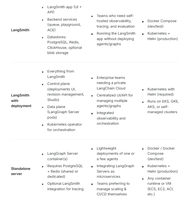 LangSmith:部署 LangSmith 应用程序的实例,该实例包括 UI 和 API 中的可观测性、跟踪和评估。最适合希望在不部署代理的情况下进行自托管监视和评估的团队