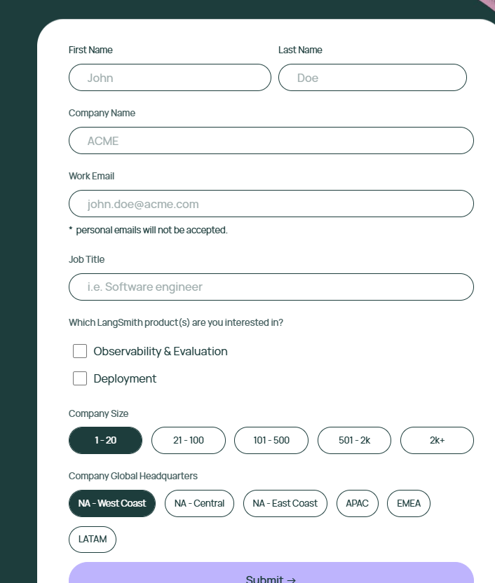LANGSMITH_LICENSE_KEY 这个目前是需要联系 官网的销售团队 Talk to our team 点击链接[Talk to our team]去填写信息