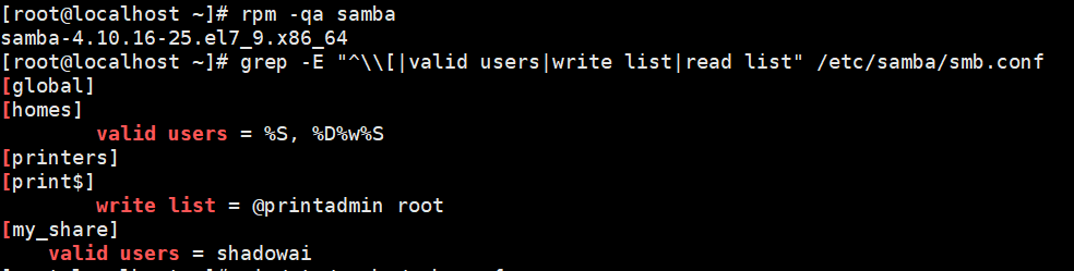 或者直接:grep -E "^\\\\[|valid users|write list|read list" /etc/samba/smb.conf,分别是找