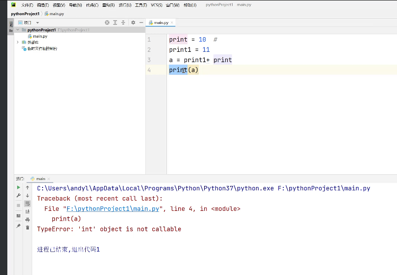 (4)变量名最好别用Python内置函数名(比如list/dict等),虽然语法允许,但容易引发混淆。例如把内置函数名(如print)用作变量名是允许的,但这样做会覆盖原有函数功能。比如先写print=10,再写print(1+1)就会报错——因为此时print已经变成普通变量,不再是函数了。虽然Python允许这种操作,但会导致内置函数失效,所以编程时要避免使用内置函数名作为变量名。这种错误不会立即显现,而是在后续调用被覆盖的函数时才暴露,属于典型的"埋雷"行为。