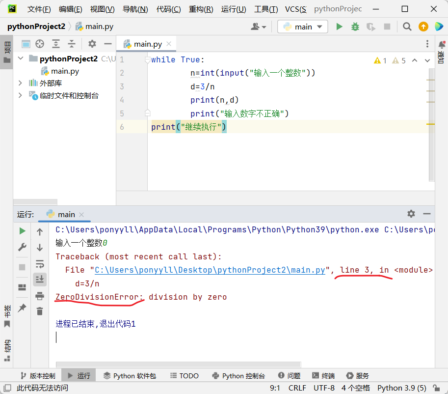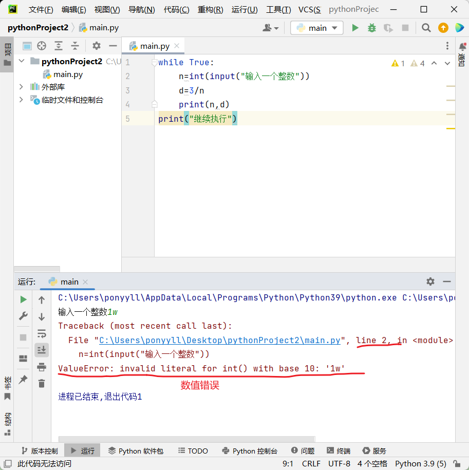 当我们用input()接收用户输入并强制转为整数时,如果用户不小心输入了字母程序就会报错ValueError(值错误)。