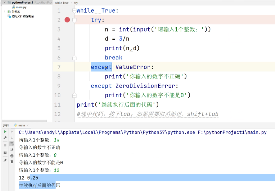 try-except异常处理结构:当try代码块出现异常时,系统会自动跳转到except代码块执行。比如可以用它来拦截用户输入的异常值。