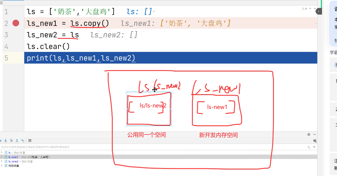 (3)copy():会真正创建新内存空间,把原列表内容完整复制过去,此时修改原列表不会影响新列表。直接赋值(lst2 = lst)只是给同一块内存空间起了新名字(如lst2),本质上lst和lst2是同一个对象。所以用clear()清空其中一个,另一个也会同步清空。