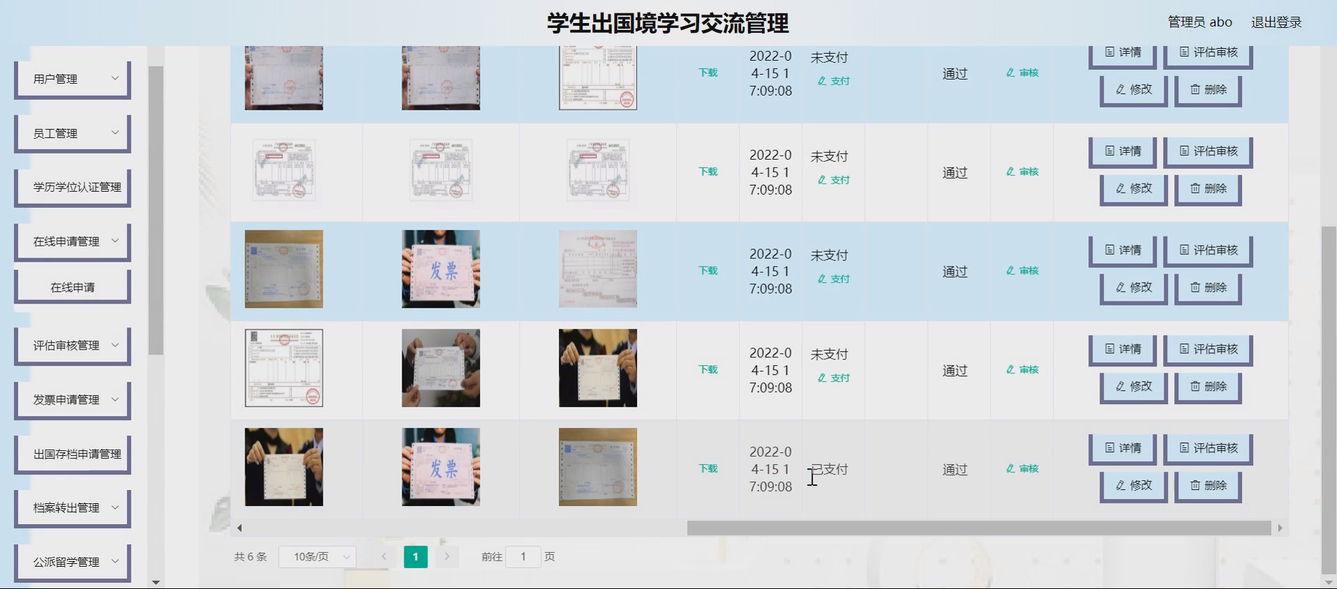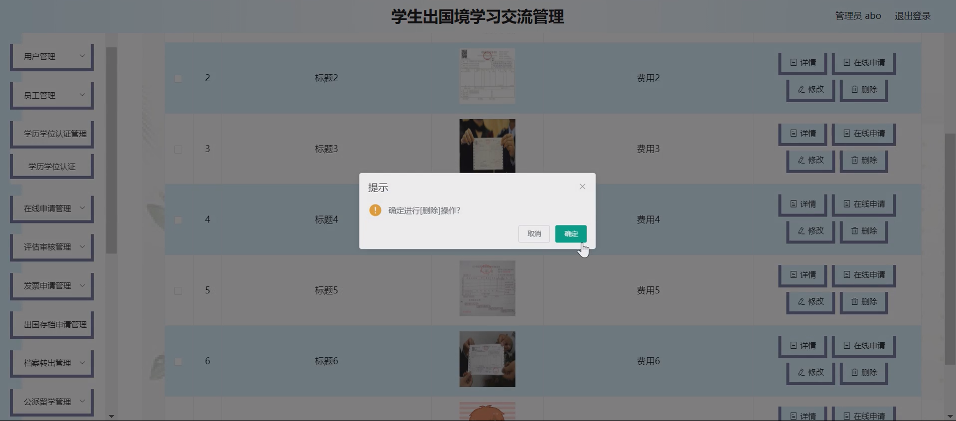 系统项目功能:学生,学历学位认证,在线申请,员工,评估审核,发票申请,出国存档申请,档案转出,公派留学,留学手续,回国申请,在外求学,在外求学分类,国际合作分类,国际合作,学院老师,学校老师,合作报名