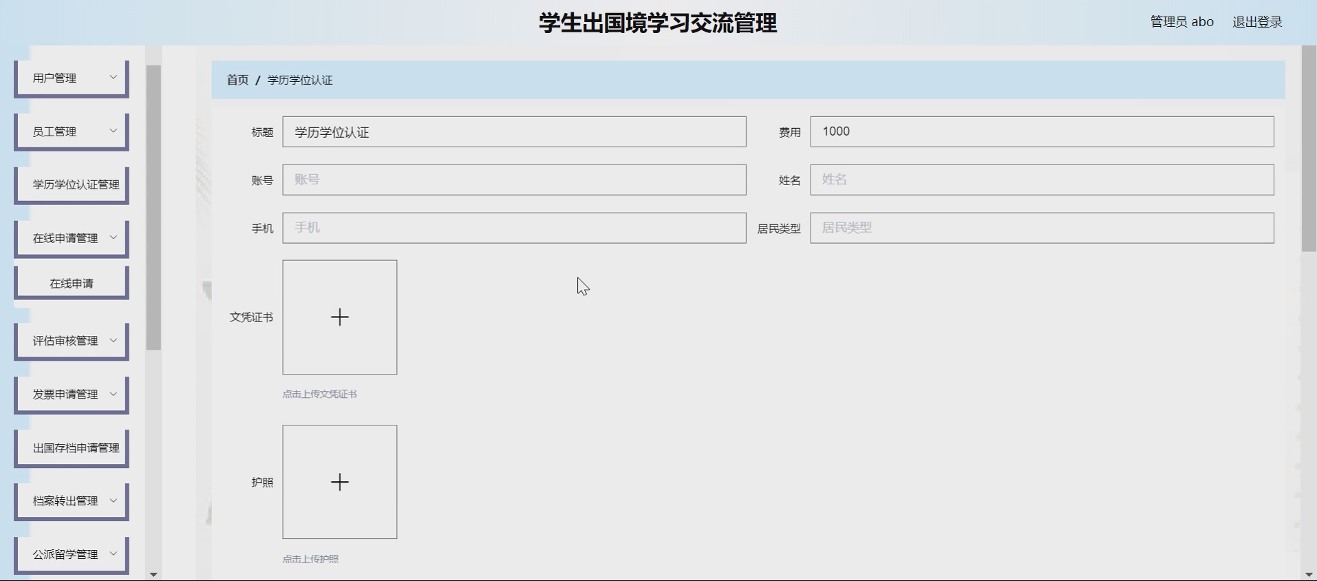 手续与认证模块:①留学手续:学生在线查询办理指南、提交材料审核;②学历学位认证:学生提交认证申请,管理员协助审核办理。
