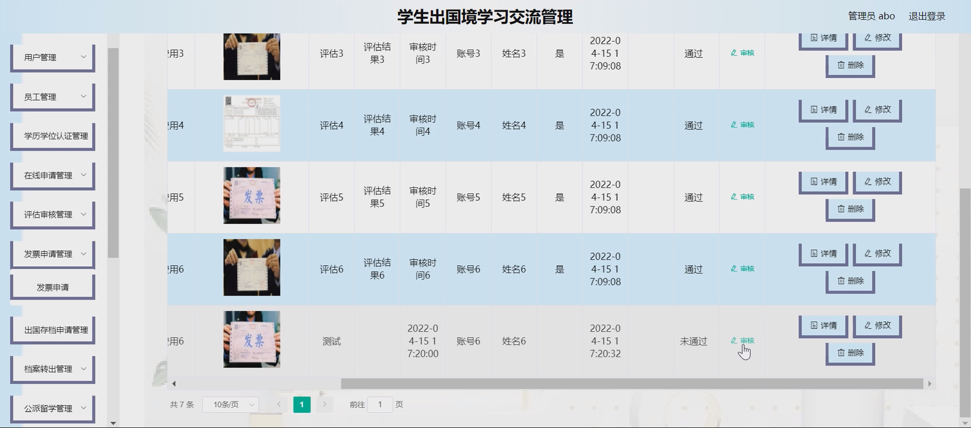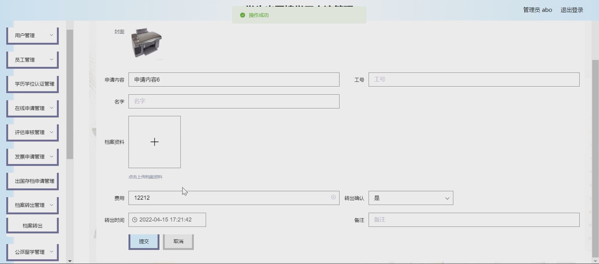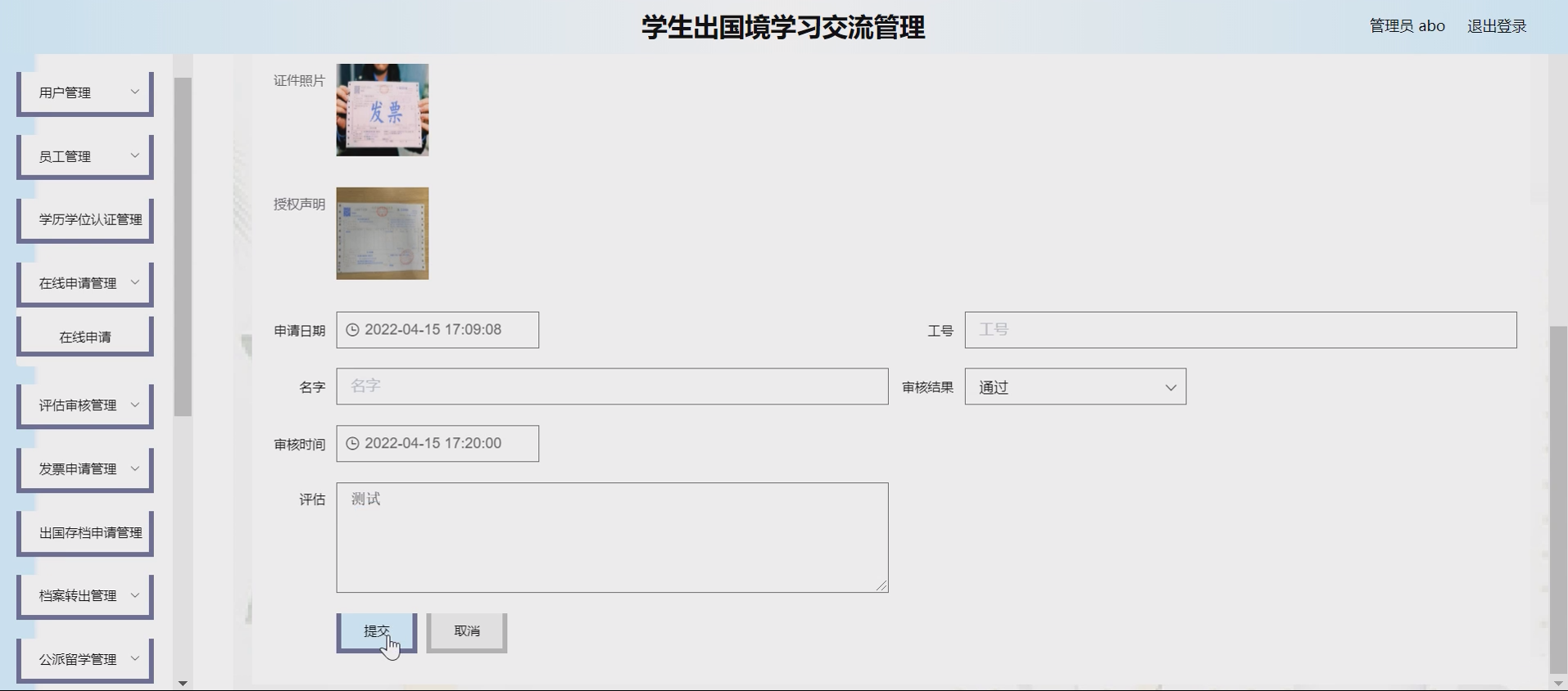 财务与档案模块:①发票申请:学生在线申请交流相关发票,管理员审核处理;②出国存档申请:学生申请档案临时存档,审核通过后执行档案转出。