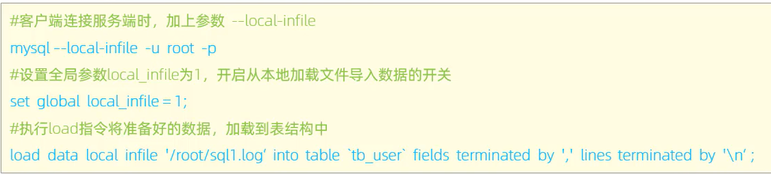 如果一次性需要插入大批量数据(比如 几百万的记录),使用insert语句插入性能较低,此时可以使用MySQL数据库提供的 load指令进行插入