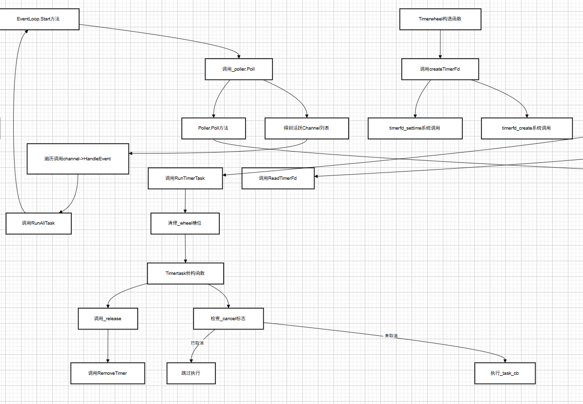 timerwheel内部有一个timerid是linux系统提供的定时器,用于定时功能,并有一个Channel对象用于对timerwheel回调任务的监听,每当timerfd进行一步,都会触发监听的可读回调,进行对时间轮内部tick刻钟移动。