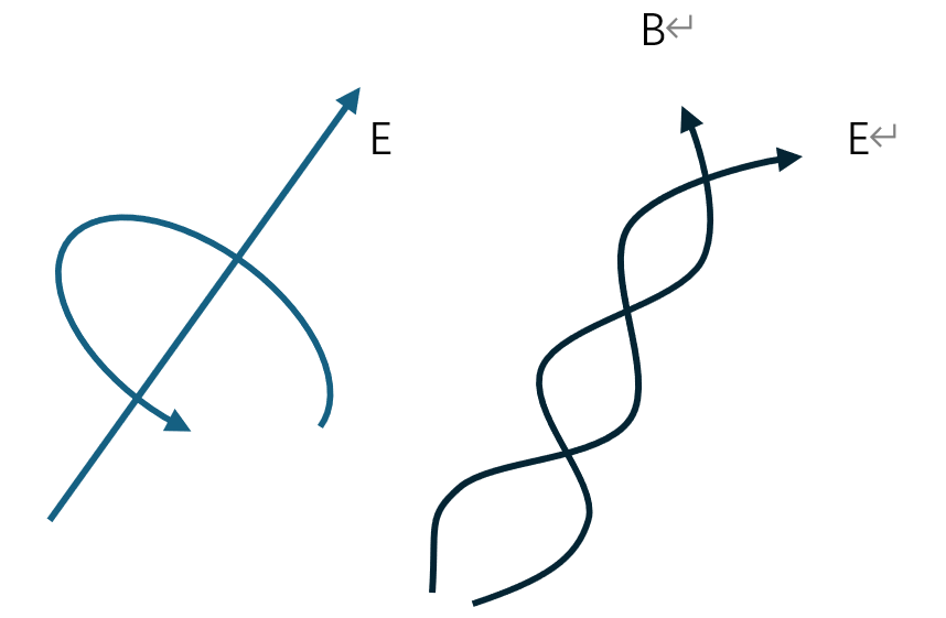 回顾上述讨论中EB关系,我们曾经提到,若站在特定视角,E场就不再是平直的,B场也不再是闭合的,两者在那个视角上获得形态上的平权表达的时候,就是两条互相缠绕的场线,