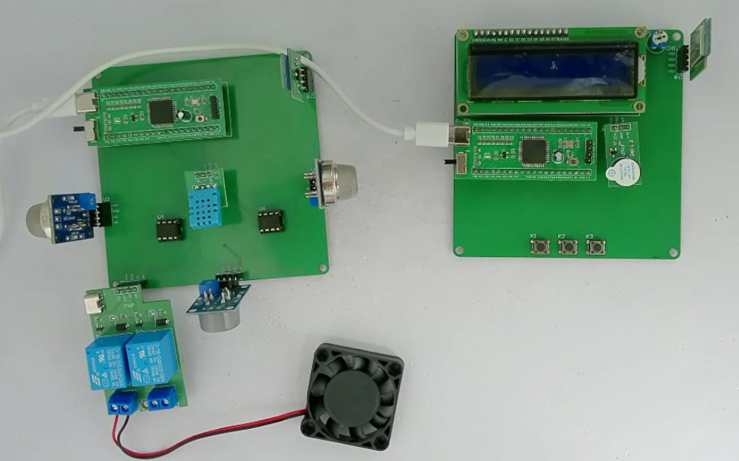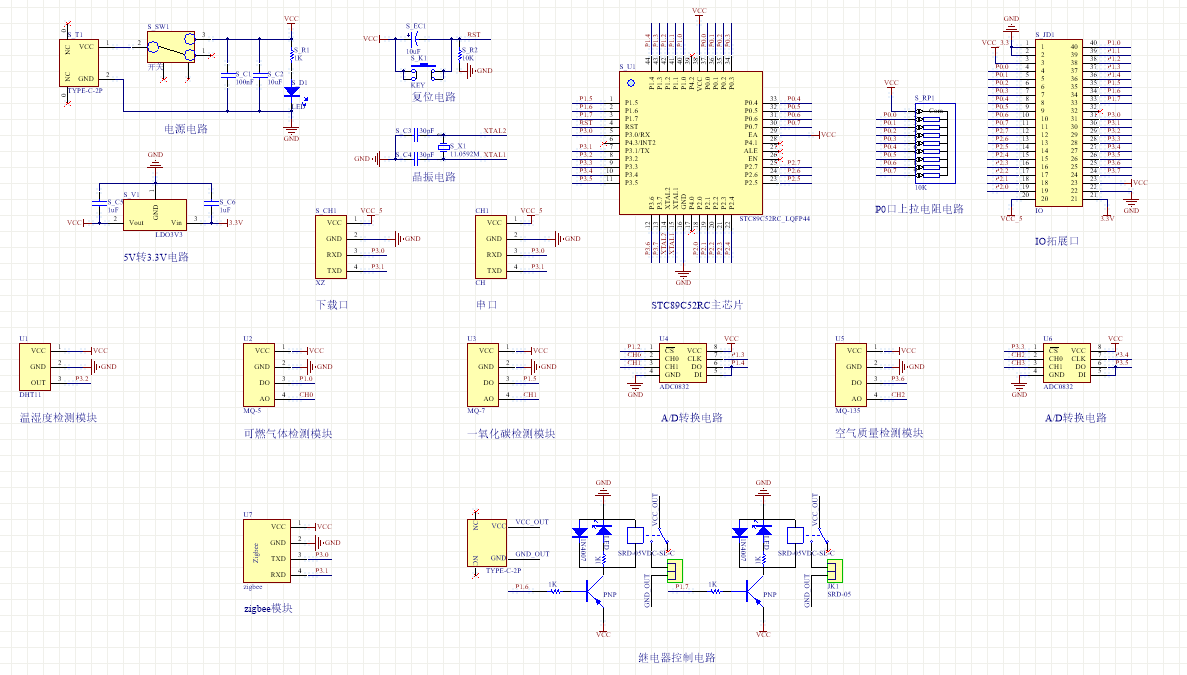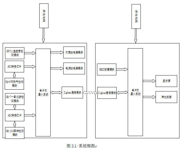 本设计以STC899C52单片机为核心控制器,分为从机和主机两部分协同工作。从机部分主要负责环境数据采集与处理,主机部分负责数据接收、显示以及报警处理。从机的输入由五部分组成,第一部分是DHT11模块,用于检测当前环境的温湿度;第二部分是MQ-5模块,用于检测当前环境的可燃气浓度;第三部分是MQ-7模块,用于检测当前环境的一氧化碳浓度;第四部分是MQ-135模块,用于检测当前环境的有害混合气体浓度;第五部分是供电模块,为从机提供电源。输出由两部分组成,第一部分是风扇模块,用于在测量值超出最大值时开启风扇;第二部分是电源继电器模块,用于当气体数据发生异常时断开电源。除此之外还有Zigbee模块,即作为输入也作为输出,用于将数据发送至主机端。系统框图如图3.1所示。