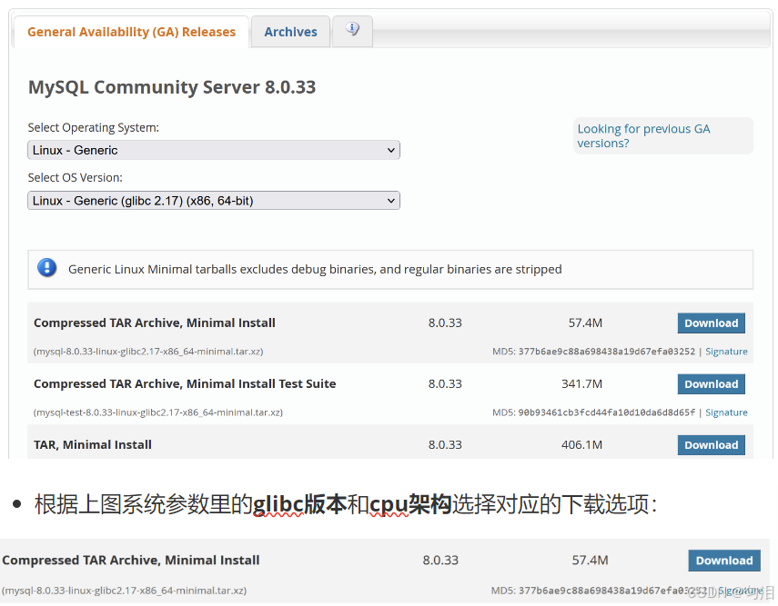 - 官方下载地址:https://dev.mysql.com/downloads/mysql/(可选择对应系统 / 版本);