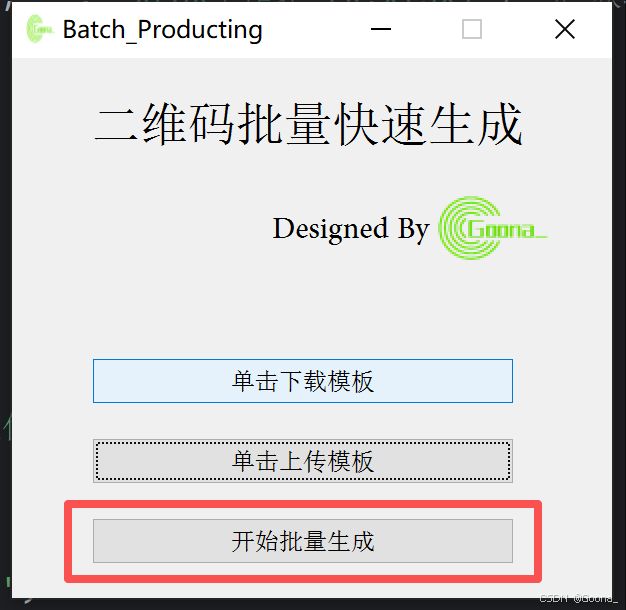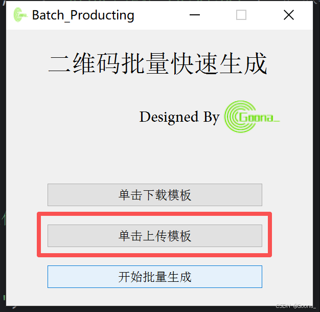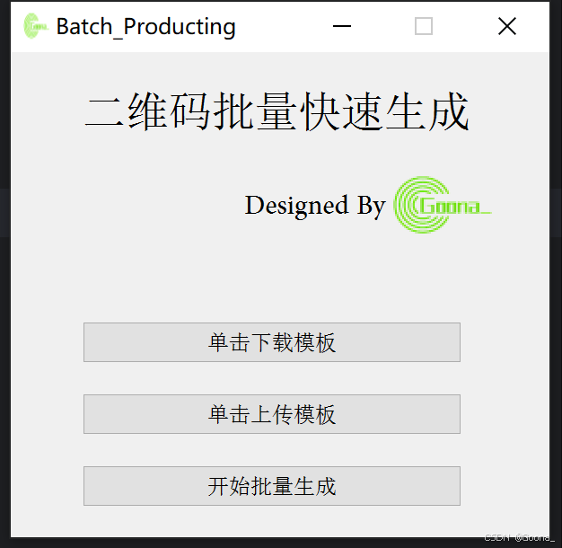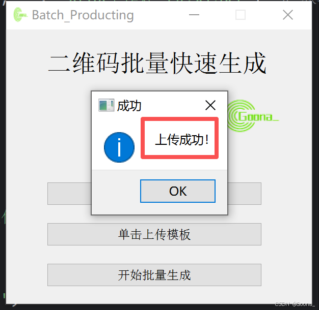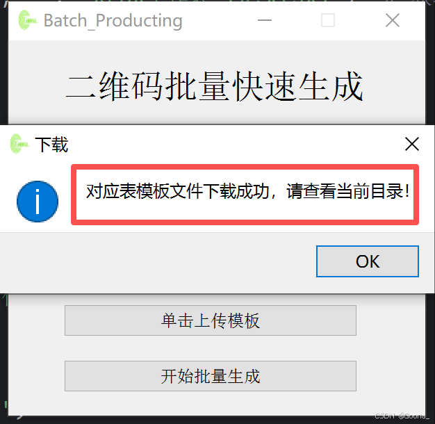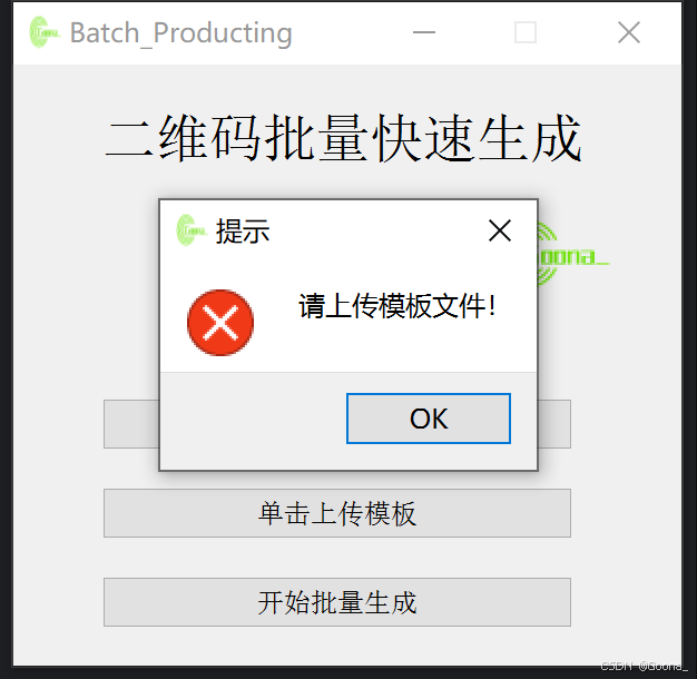 以标志位upload_flag的状态为依据判断用户是否上传符合要求的模板excel文件,并读取数据分别存储在列表name_list和content_list中,前者用于重命名文件,后者用于写入二维码;新建文件夹“result”,用于存储批量生成的全部二维码照片;最后,通过循环,调用自定义函数shengcheng,返回生成的每一张二维码照片,命名后存储。