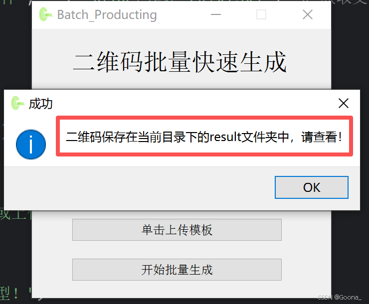 点击“开始批量生成”,即可根据模板excel文件所填写内容生成具有相应内容的二维码,并以模板excel文件中第一列数据进行相应命名。最终结果保存在本地“result”文件夹中。