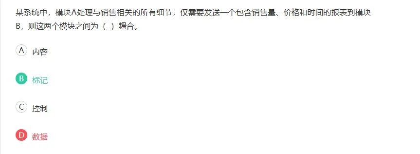 如果一组模块通过数据结构本身传递,则称这种耦合为标记耦合;