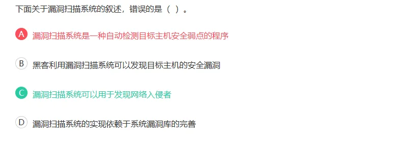 初看每个选项都好像是对的,最后再仔细识别网络入侵者和漏洞扫描是两回事。