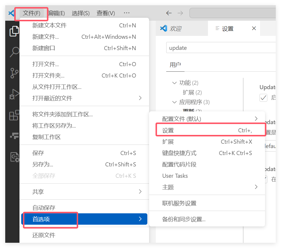 打开Vs Code设置,搜索“update”/自动更新,选择“none”,避免后续更新造成意想不到的问题。
