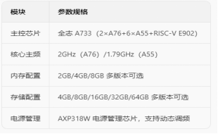 全志 A733 是一款面向嵌入式设备的八核 AI 处理器,核心架构采用2 颗 Cortex-A76 大核 + 6 颗 Cortex-A55 小核的异构组合,大核主频最高可达 2GHz,小核主频为 1.79GHz,同时集成 1 颗 RISC-V E902 实时内核,兼顾高性能运算与低功耗实时控制需求。