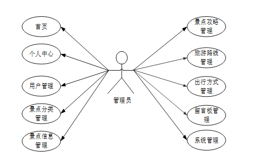 (a) 管理员;管理员使用本系统涉到的功能主要有:首页、个人中心、用户管理、景点分类管理、景点信息管理、景点攻略管理、旅游路线管理、出行方式管理、留言板管理、系统管理等功能。管理员用例图如图3-1所示。