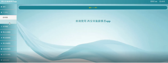 管理员登录进入西安市旅游推荐app查看首页、个人中心、用户管理、景点分类管理、景点信息管理、景点攻略管理、旅游路线管理、出行方式管理、留言板管理、系统管理等内容进行详细操作,如图5-10所示。