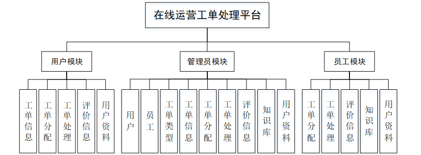 系统分成三个角色,根据每个角色的权限分析得出三大模块,包括管理员模块,员工模块和用户模块;管理员模块主要针对整个系统的管理进行设计,提高了管理的效率和标准。系统的总体模块功能设计如下图所示:。