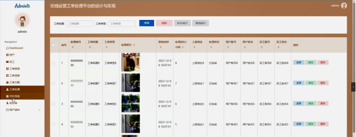 管理员点击工单处理,进入工单处理页面输入工单标题和工单类型进行搜索或删除工单处理列表,查看时长统计和绩效统计,并根据需要对工单处理详细信息进行查看、修改或删除操作。如图5-7所示: