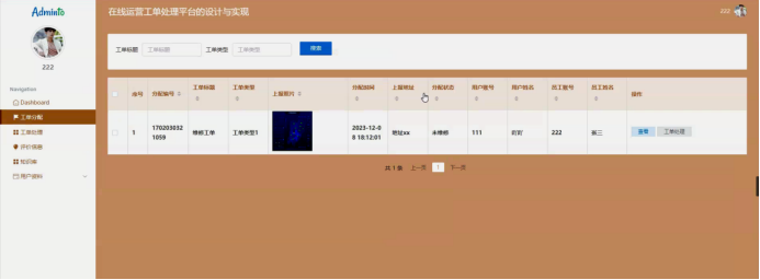 员工点击工单分配,进入工单分配页面输入工单标题和工单类型进行搜索工单分配列表,并根据需要对工单分配详细信息进行查看或工单处理操作。如图5-11所示: