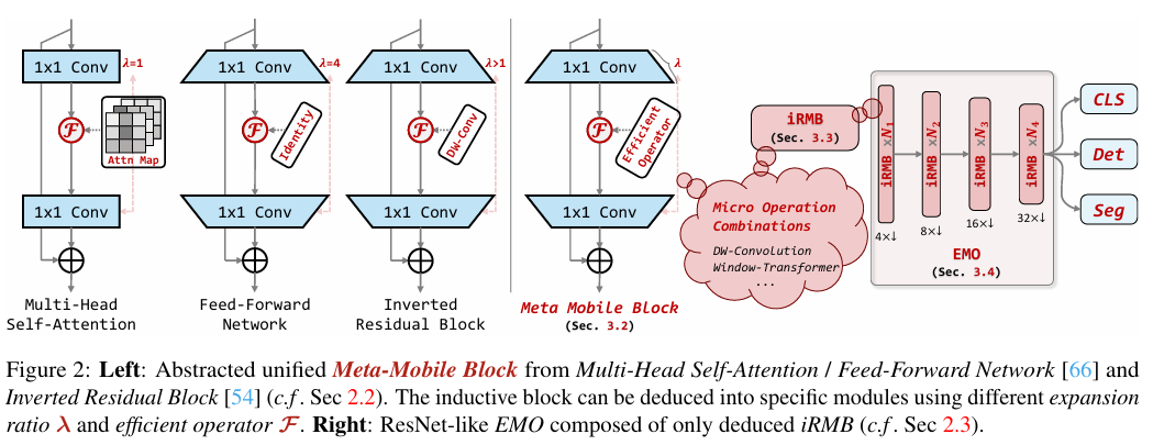 提出了元移动块(Meta-Mobile Block),通过不同的扩展比率和高效操作符,实现了模型的模块化设计,使得模型更加灵活和高效