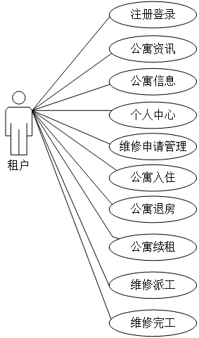 租户注册登录成功后,可以对公寓资讯,公寓信息,个人中心,维修申请管理,公寓入住,公寓退房,公寓续租,维修派工,维修完工等功能进行操作。