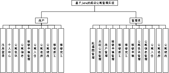 商业公寓管理系统分为两大核心部分,首先是租户操作部分,租户功能包括注册登录,公寓资讯,公寓信息,个人中心,维修申请管理,公寓入住,公寓退房,公寓续租,维修派工,维修完工等功能。另一核心为管理员后台操作部分,管理员功能包括轮播图管理,系统公告管理,租户管理,维修申请管理,维修派工管理,维修完工管理,公寓资讯管理,公寓信息管理,公寓入住,公寓退房,公寓续租等功能。