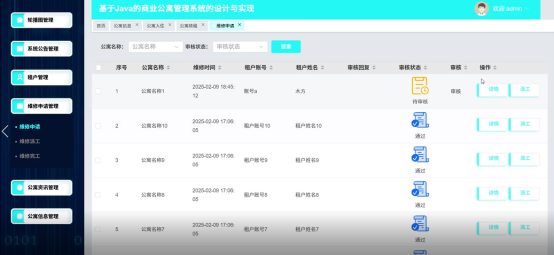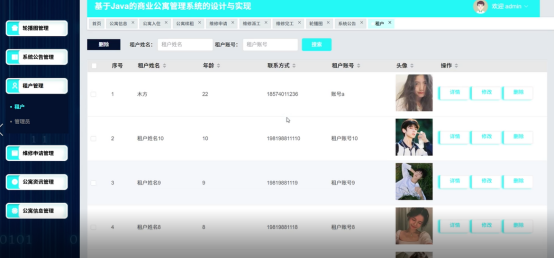 管理员登录成功后,进入首页,管理员可以对轮播图管理,系统公告管理,租户管理,维修申请管理,维修派工管理,维修完工管理,公寓资讯管理,公寓信息管理,公寓入住,公寓退房,公寓续租等功能进行操作。