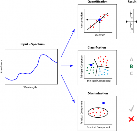 现在被大家认可的,且最常使用的定量方法是偏最小二乘法(PLS),它可以通过光谱数据(反映的“物质”)来最有效的分析解释物质的多样性及差别。另一个被普遍使用的分类方法叫支持向量机(SVM),而另一种用来将分析物与标准物进行区别的方法叫主成分分析方法(PCA)。