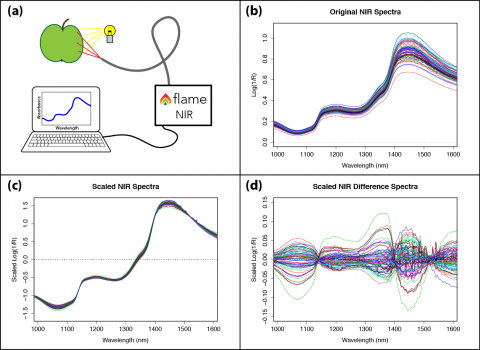同样使用图2中的搭建装置,测量出苹果表面的反射光谱,再利用化学计量学计算工具对苹果的品种进行鉴定。唯一不同点就是,我们使用可见光波段的Flame光谱仪,测量480-920nm波段的反射光谱,以此获得苹果中化合物成分信息,比如类胡萝卜素(420-500nm),花青素(540-550nm),叶绿素(600-700nm)等等。