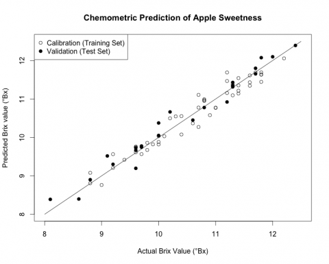 图3. 苹果真实甜度的对比图(使用实验室测量的波美度标记),并且根据红外反射光谱预测波美度