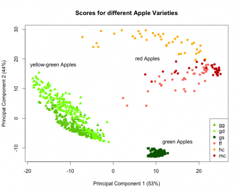 针对目前的数据,不同光谱间的97%多样性可以通过两个主成分来解释分析。不同的苹果具有不同的“分数”,比如就像图4所示,将这两种典型物质结合后,就可以将光谱表达成不同维度的数据。同时,我们可以很轻松地将苹果分成三组:绿苹果,红苹果和黄-绿苹果。有了这个图表,我们可以以同样的方式测试未知样品的图谱,获得已知典型物质的分数,然后按照该表格将该苹果进行分类。