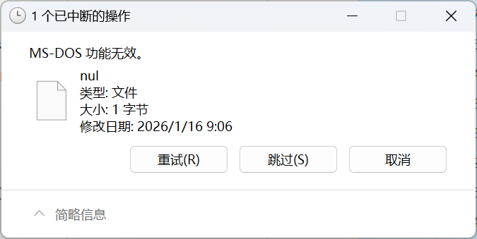但在 Windows 文件系统语义里,nul 属于保留设备名(类似 CON、PRN),导致: