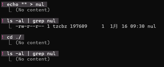 - Bash 的理解:nul 只是个普通文件名