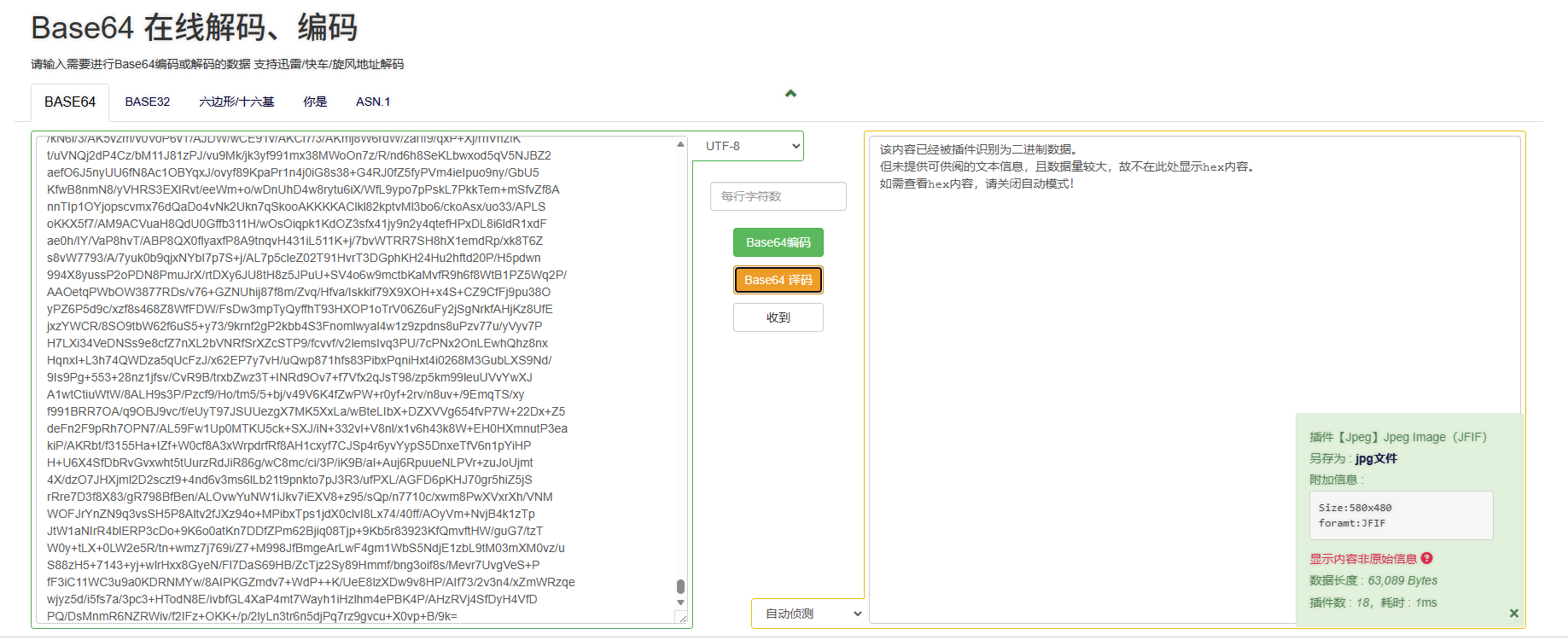 2、使用Base64编码工具进行解码,将得到的密文进行解码,网站提醒我们可以另存为jpg文件,点击另存为,我们会下载一张jpg图片。
